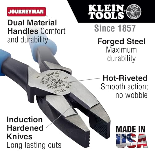 Klein J213-9NE 9-Inch Journeyman High-Leverage Side-Cutting Pliers. The Klein J213-9NE 9-Inch Journeyman High-Leverage Side-Cutting Pliers features the high-leverage design where the rivet is closer to the cutting edge for 46-Percent greater cutting and gripping power than other pliers designs, the streamlined design with sure-gripping, cross-hatched knurled jaws, the induction-hardened cutting knives for long life, and a hot-riveted joint ensures smooth action and no handle wobble.