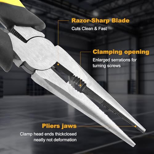 Multi-Purpose Functionality: Perfect for cutting steel wire, copper wire, electrical wire, and iron wire, these long nose pliers also excel at gripping, tightening, loosening nuts and screws, twisting, clamping, and stripping. The extended slim jaw design makes them ideal for working in narrow or hard-to-reach spaces