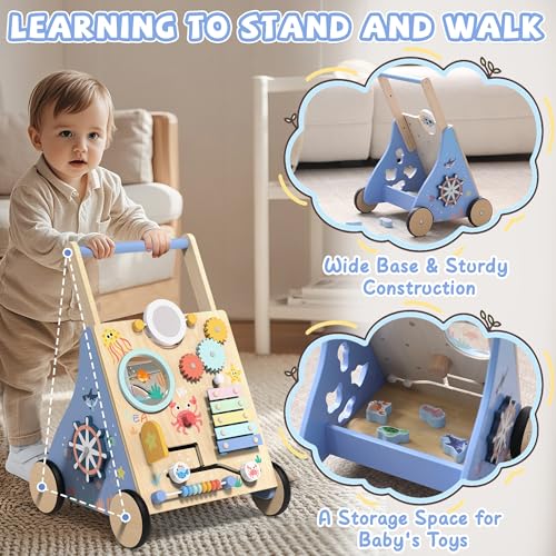 Ocean-Themed Wooden Baby Walker with Activity Center, Montessori Push Walker Toy for Babies 18 Months, Safe First Steps Baby Walking Aid for Boys & Girls