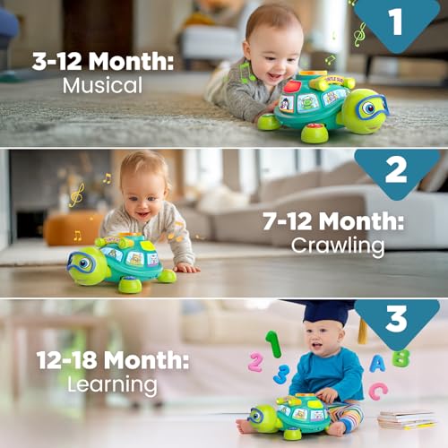 Interactive Learning & Crawling Fun: This musical turtle teaches baby songs, 123s, ABCs, colors and animal sounds while encouraging crawling with moving/nodding actions. Colorful lights and music boost motor skills and sensory development.