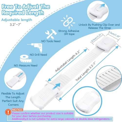 👶【Multipurpose Use】Flexible and adjustable length strap works on both flat surface and around corner. baby locks can be used on drawers, cabinets, refrigerators, microwaves, bedside tables, toilets, medicine storage cabinets or detergents. The double-sided adhesive guarantees optimal hold on any type of material such as wood, glass, iron, plastic, etc.