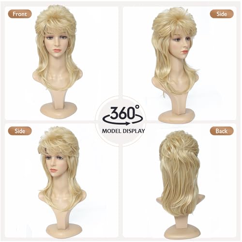 AUTHENTIC STYLE: Classic 80s mullet design featuring voluminous layers, feathered bangs, and shoulder-length cut in light blonde shade