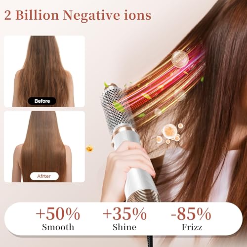 Negative Ion Technology 6 in 1 Hot Air Brush: Blow dryer brush Hair dryer brush in one set adopts negative ion technology, which can release negative ions 360°, reduce frizz and static electricity, our air hair styler reducing damage&better at the same time condition your hair; Ceramic coating saturates the airflow, distributes heat evenly, hair dryer brush penetrates the hair quickly, and accelerates drying from the inside out to help you create healthy hair.