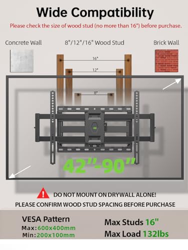 Universal Design: This full motion TV mount fits for most of 42-90inch TVs up to 132lbs with VESA size 200*100mm to 600*400mm available and max 16″ Wood Stud space. Not perfect fit your TV? Please contact us and we’ll do our best to solve the problem for you!