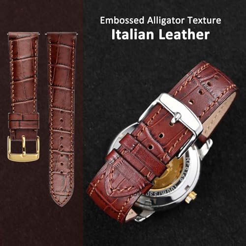 WOCCI 20mm Watch Band, Italian Leather, Embossed Alligator Grain, Gold Buckle (Brown)