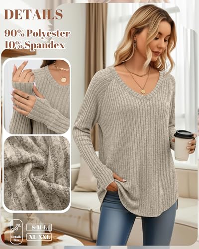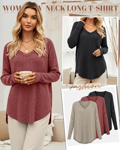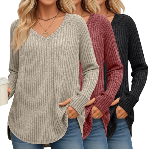 3 Pack Women’s Long Sleeve Sweaters with Thumb Hole, Ribbed V Neck Loose Tunic Tops Curved Hem Side Split Shirts