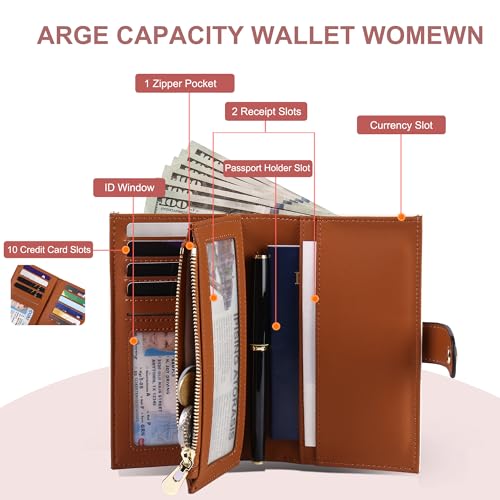 Large Capacity Womens Wallet: With 10 RFID-block credit card slots, 1 ID window, 1 zipper pocket for the coin and keys, 3 full-length compartments for receipts, 1 passport compartment, 1 pen holder and 1 deep cash slot, this medium size wallet for women can meet all your daily demands.