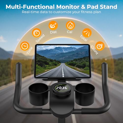 Adjustable Height: Specifically designed for family fitness, the exercise bike features adjustable 2-way handlebars and a 7-way seat. you can choose your comfortable riding height. The cushioned saddle design ensures long-lasting comfort. It includes an Ipad stand, a dual water bottle stand, an LED display, and easy-to-move wheels to meet your fitness needs and preferences