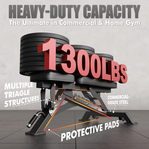 1300LB Capacity: Our robust weight bench features a stable triangular base and enlarged anti-slip feet. Rated for up to 1300 lb, it perfectly meets the demands of high-intensity training, ensuring safety during extended workouts.