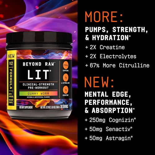 BEYOND RAW LIT V2 Clinical Strength Pre Workout Powder, Hits Harder, Bigger Pumps, Caffeine, L-Citrulline, Creatine, Gummy Worm, 30 Servings