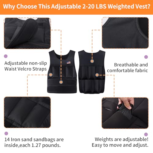 ♥【Weighted Vest for Women Men】Wolliwa waist size and sandbags weights are adjustable! 2-20 lbs weighted vest is made of breathable black lycra,black T-Cloth and Iron Sand,comfortable to wear and take off.⭐Vest Cloth is fixed 2 pounds⭐Black weights adjustable weighted vest,7 inside front pockets,7 inside back pockets.Total put 14 sandbagd bags in pockets,each 1.27 pounds.⭐Depending on the need and intensity of the exercise: The weight vest can be adjusted from 2 to 20 pounds.⭐Weights can be easily and flexibly adjusted,to match your physical skills and exercise endurance!⭐⭐Each sandbag is filled with premium iron sand,which offers lasting comfort and unwavering reliability.