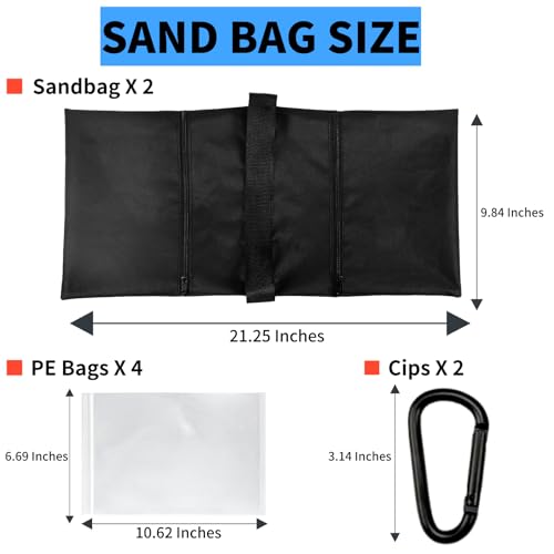1. Package Contents and Notes:Sand bags package contains 2 pcs sandbags, 2 pcs aluminum clips and 4 pcs PE bags. Notes:The sandbag are empty and not loaded with sand