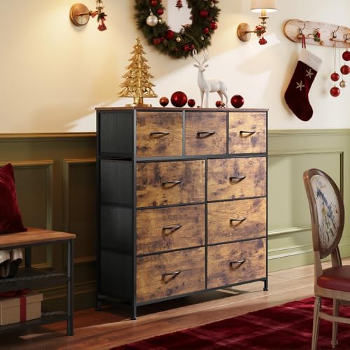 WLIVE 9-Drawer Dresser, Fabric Storage Tower for Bedroom, Hallway, Entryway, Closet, Tall Chest Organizer Unit with Fabric Bins, Steel Frame, Wood Top, Easy Pull Handle, Rustic Brown Wood Grain Print