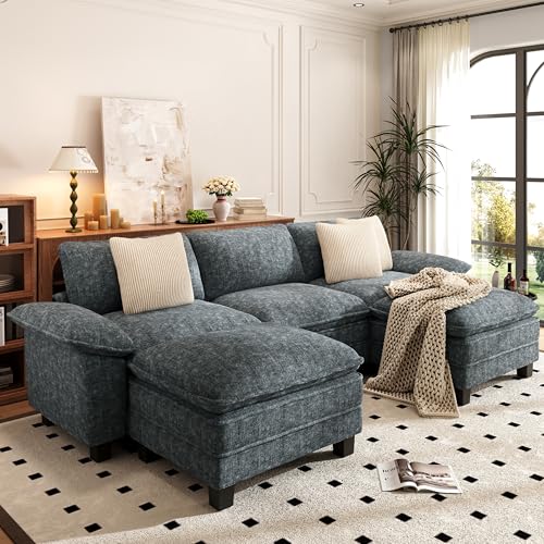 PHI VILLA Cloud Modular Couch Sets, 123.6″ Sectional Sofa with U-Shaped Chaise, 5-Seater Couches with 2 Movable Ottomans for Living Room, Chenille Fabric, Dark Cyan