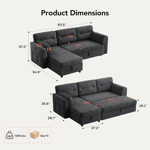 Amada Sectional Sofa Bed with Reversible Storage Chaise, Pull Out Couch Bed Convertible Cloud Chenille Couch with USB Charging & Side Pockets, L Shaped Modular Couches for Living Room Apartment