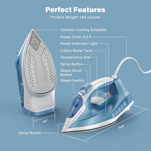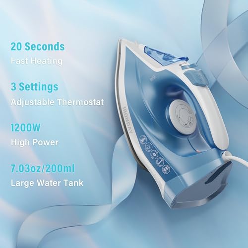 Steam Iron for Clothes Fast Heating, 1200W Iron with Non-Stick Ceramic Soleplate, Self-Cleaning, Burst of Steam, Spray Mist, 7.03oz Water Tank Ironing Clothes for Home, Blue