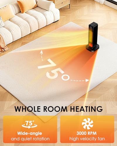 SUPERIOR AND INSTANT WARMTH: Powerful 1500W PTC ceramic heating makes this space heater to bring you warmth within 3 seconds. This portable heater is also equipped with two high speed fans and can rotate 75° smoothly. The heaters bring cozy and consistent warmth to your room.