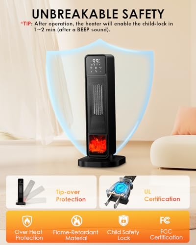 UNBREAKABLE SAFETY: Our space heater is equipped with tip-over and overheat protection, which will shut off the heater immediately when it tip-over or overheat. Meanwhile this electric heater is made of fire-resistant ABS material. Also the enhanced safety plug and child-lock of the heater will always protect your children and family. Please note that after running for 1~2 min without operation (after a BEEP sound) the heater will enable child-lock automatically.