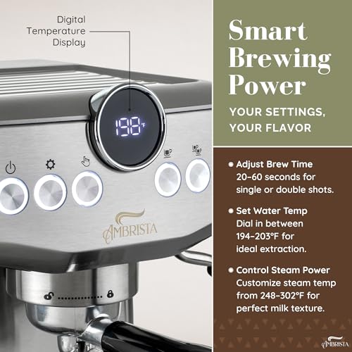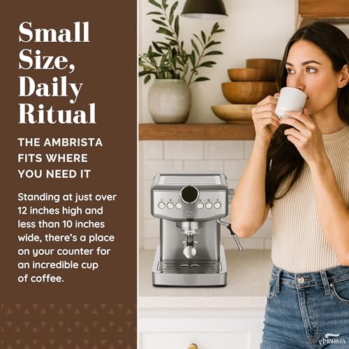 MAKE YOUR FAVOURITE ESPRESSO COFFEE AT HOME! The AMBRISTA espresso machine with milk frother allows you to prepare all your favorite espresso based coffees. You can enjoy a barista brewed latte, cappuccino or macchiato at home. Stainless steel appearance, stylish and durable, ideal for any size kitchen. This compact espresso coffee maker is perfect for home or office use