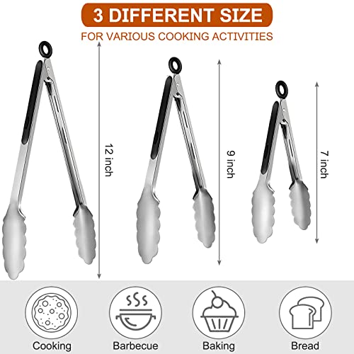 9 Pieces Stainless Steel Kitchen Tongs Grilling Locking Cooking Tongs Non-Slip Metal Food Tongs for Cooking, Salad and BBQ, 7, 9 and 12 Inch