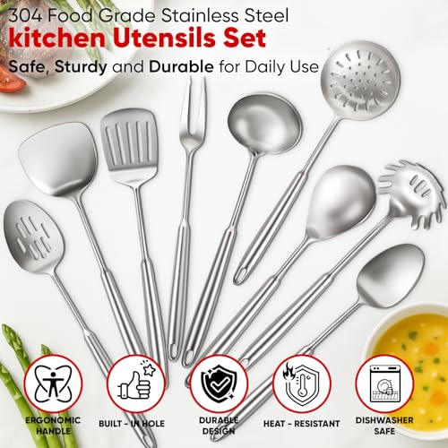 Newness 9 Pcs Cooking Utensils Set, 304 Stainless Steel Kitchen Utensils Set, Metal Kitchen Accessories, Include Soup Ladle, Slotted Skimmer Spoon, Spaghetti Spoon and Spatula, Dishwasher Safe