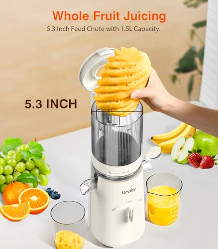 【5 Inch Feed Chute with 50.7oz Capacity】Our Juicer Machines adops 5 Inch Feed Chute with 50.7oz large capacity, you can put whole fruits or veggies to press, no need to pre-cut. Saving time and increasing the Juicing efficiency