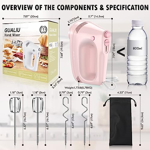 Electric Hand Mixer with Stainless Steel Whisk, Dough Hook Attachment and Storage Bag, Handheld Mixer for Baking Cakes, Eggs, Cream Food Mixers. Turbo Boost /5 Speed Kitchen Blender PINK