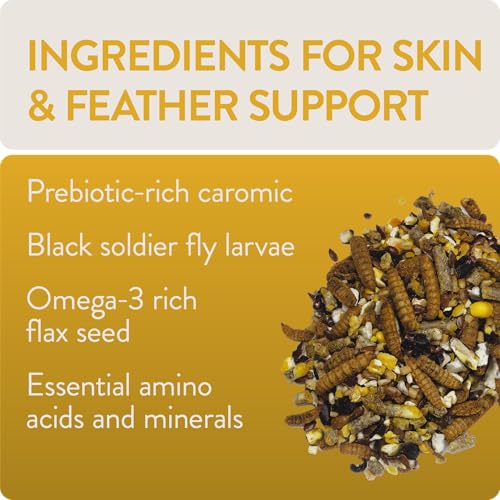 INGREDIENTS FOR SKIN & FEATHER SUPPORT: Shine is made with prebiotic-rich caromic to maintain gut health and nutrient absorption, protein-packed black soldier fly larvae for feather growth and health, omega-3 rich flax seed to help coat and protect feathers, and essential amino acids and minerals for feather structure.
