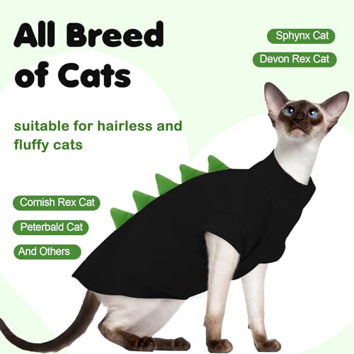 DENTRUN Sphynx Cat Clothes, Cute Dinosaur Design Hairless Cat Costume, Breathable Cotton Shirts Cat Clothes for Cats Only, Round Collar Kitten Daily T-Shirts with Sleeves, Cats Funny Cosplay Apparel