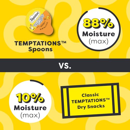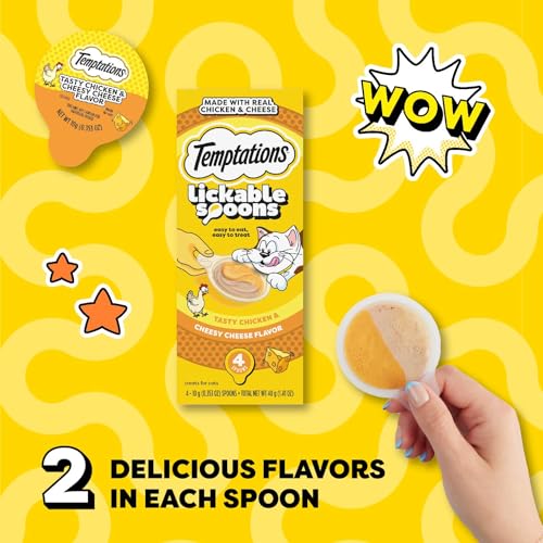 Your feline’s favorite cat treat brand can be enjoyed in a Lickable Spoon format! Stir up some delicious moments with your furry best friend with Temptations Lickable Spoons Tasty Chicken and Cheesy Cheese flavor lickable wet cat treat. The creamy treat comes in a specially designed spoon and combines two tasty flavors. The purr-fect spoon size makes it easy to eat and easy to treat your cat for a memorable bonding experience. Temptations Lickable Spoons can also be used as a meal complement to make mealtime extra special. Temptations Spoons, with added vitamins and minerals, have no fillers or artificial flavors. Enjoy treat time with your furry feline, one spoon at a time!
