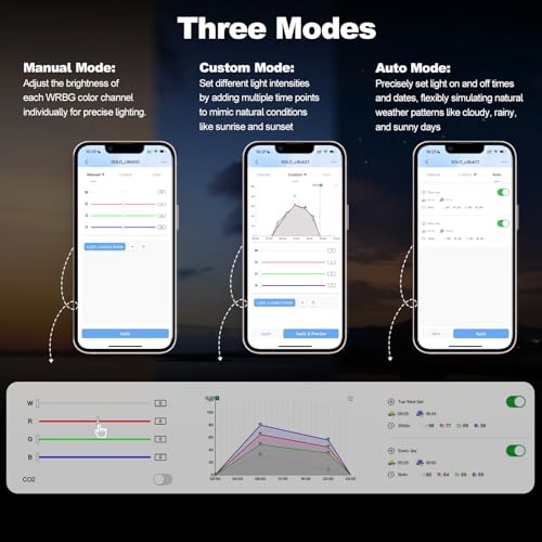 Manual/Auto/Custom 3 Modes: The aquarium light offers Custom Mode, allowing you to set up to 24 time points for a personalized sunrise and sunset cycle. Auto Mode lets you schedule light simulate dynamic weather conditions such as cloudy, rainy, or sunny days, creating a natural environment in your tank. Manual Mode provides precise brightness and color adjustments