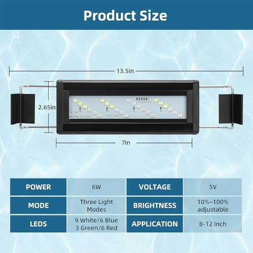 LED Aquarium Light Full Spectrum Fish Tank Light with Dimmer White Blue Red Green LEDs Fish Tank Light with Three Lighting Modes and Extendable Bracket for 8 Inch to 12 Inch Aquarium