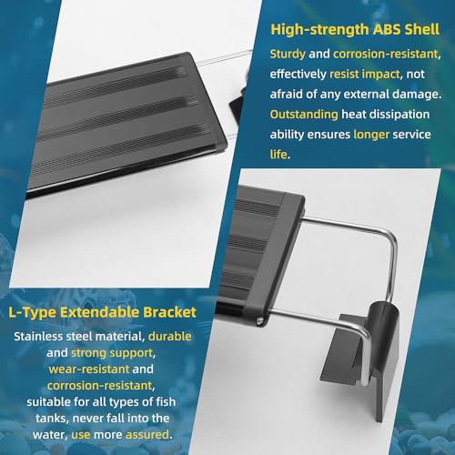 【Sturdy And Durable】: High-strength ABS shell, sturdy and corrosion-resistant, can effectively resist the impact, not afraid of any external damage. Outstanding heat dissipation ability, giving the lamp beads long-lasting protection, longer service life. L-type extendable bracket, durable and strong support, not easy to bend, suitable for all types of fish tanks, no need to worry about falling water. Stainless steel material, wear-resistant and corrosion-resistant, use more assured.