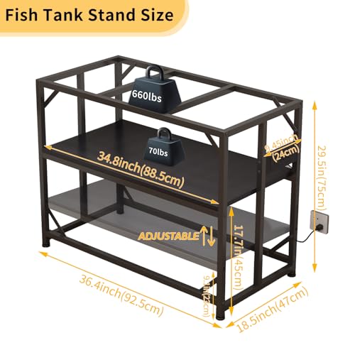 【DURABLE & STURDY FISH TANK STAND】The Metal Fish Tank Stand measures 36.4″ W x 18.5″ D x 30″ H, engineered with heavy-duty steel and premium particle board to support up to 660 lbs. Its adjustable feet ensure stability on any surface, making it the perfect choice for your aquarium stand or terrarium stand.