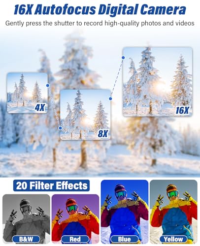 【Multi-Function Photography】This 4K digital camcorder features a specially designed mode dial for quick function switching, offering multiple creative options including date stamp, exposure compensation (-3.0 to +3.0), video pause/playback, time-lapse, and slow-motion modes. With 16x digital zoom for capturing distant subjects, it’s ideal for travel, wildlife, or everyday videography. Additional features like image stabilization, burst shooting, smile detection, self-timer, and artistic filters empower you to push creative boundaries.