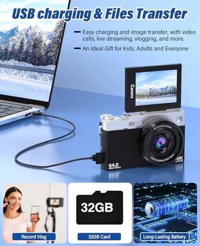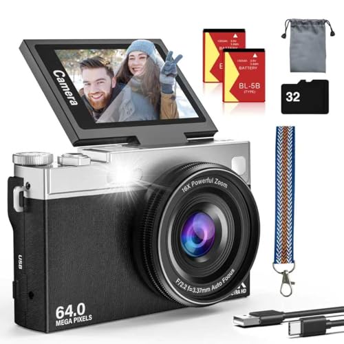 2025 New 4K Digital Camera for Photography and Vlogging, 64MP & 2.88″ 180° Flip Screen Travel Cameras with 16X Zoom, 32GB SD Card, 2 Batteries, Anti-Shake, Perfect for Teens and Beginners (Black)