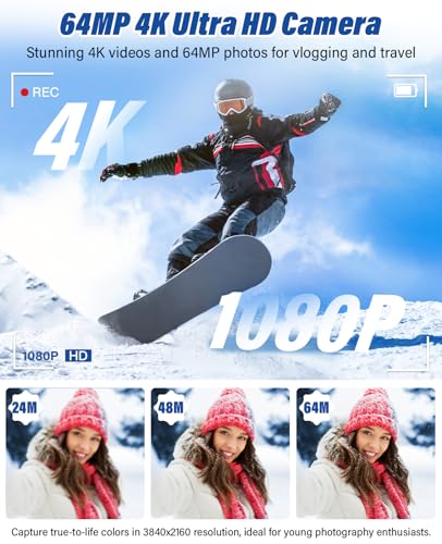 【4K Digital Camera With Autofocus】This digital camera is equipped with the latest advanced CMOS sensor, capable of capturing vibrant 64MP photos and recording 1080 video at 30fps. The built-in fill light enhances visibility in low-light conditions, ensuring your videos look polished and professional. With intuitive system settings and a user-friendly interface, it’s perfect for beginners and teens, making it an excellent choice for everyday use and travel photography.