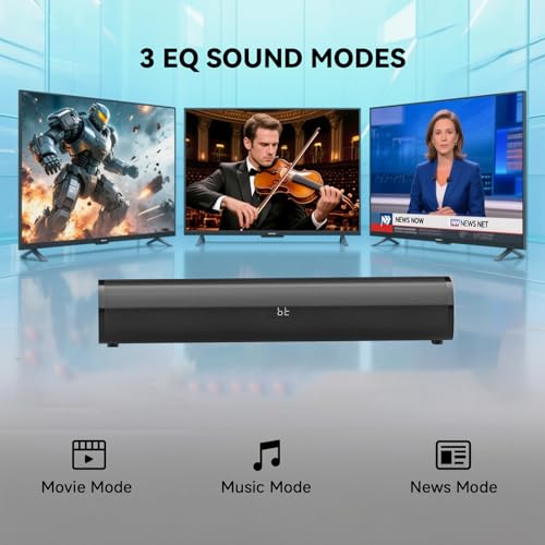[3 Music Modes for Every Moment] Switch between Movie, Music, and News modes using the remote. The TV sound bar fine-tunes bass, treble, and clarity, and each sound bar mode enhances your audio experience. Every sound bar delivers crisp dialogue and immersive sound